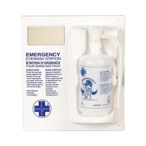 Made of high-impact plastic, this eyewash station is white, highly visible, and holds one 1L (32oz) eyewash bottle. Mirror included in order to view contaminated eye or face. Features 4 pre-drilled holes for easy mounting or relocation. Printed with bilingual instructions.